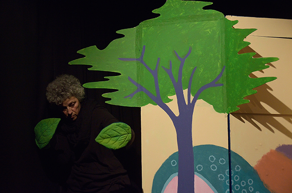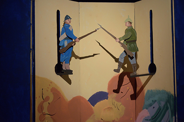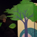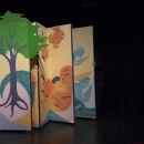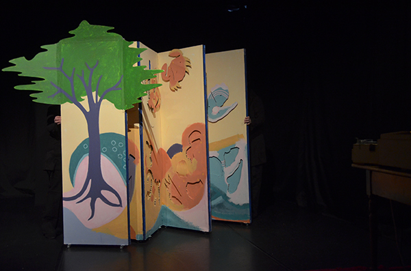 Scénographie: Inspiré par la forme du livre de « La prose du transsibérien » illustré par Sonia Delaunay, un paravent constitue le décor et offre le cadre du jeu : un paravent accordéon, qui peut être déplacé, tourné en rond, s’ouvrir, se refermer, se plier, se déplier…en quelques mots: être vivant, mobile et RESPIRER. Les marionnettes jouent avec, dans, autour ou dessus le paravent.