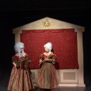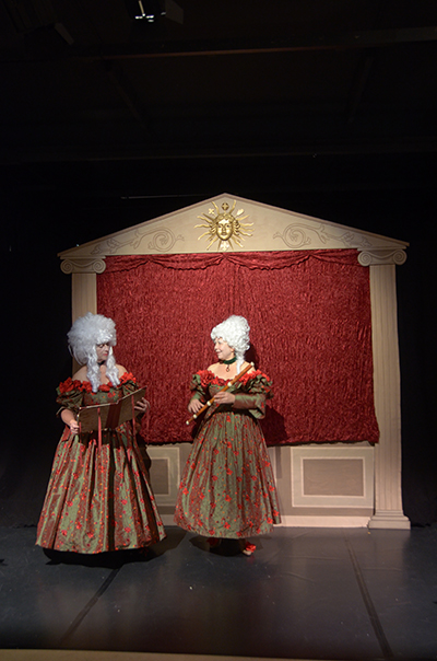 Devant un castelet, deux dames de la cour de Louis XIV disent des fables de La Fontaine :l’une d’elle s’accompagne de sa flûte, l’autre soutient le jeu des marionnettes, qui prennent vie sur la scène du théâtre.